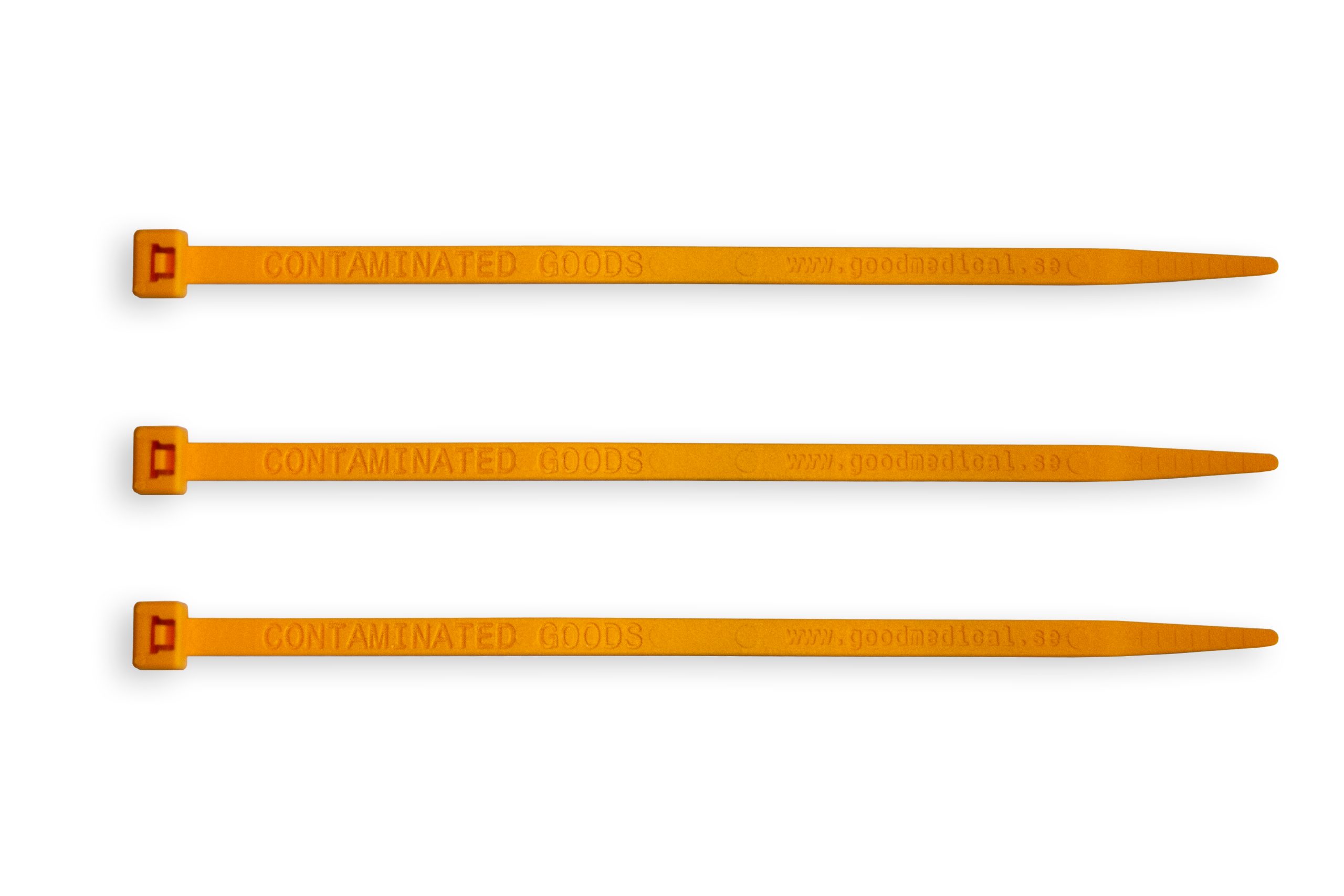 Cable ties for closing laundry and waste bags. Yellow with the label “Contaminated goods”. The cable ties helps to ensure the contents of laundry and waste bags with the use of color code and labeling.
